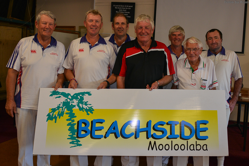 Winners Gavin Lea and his team with Murray Hill, president of Burnside Bowling Club
